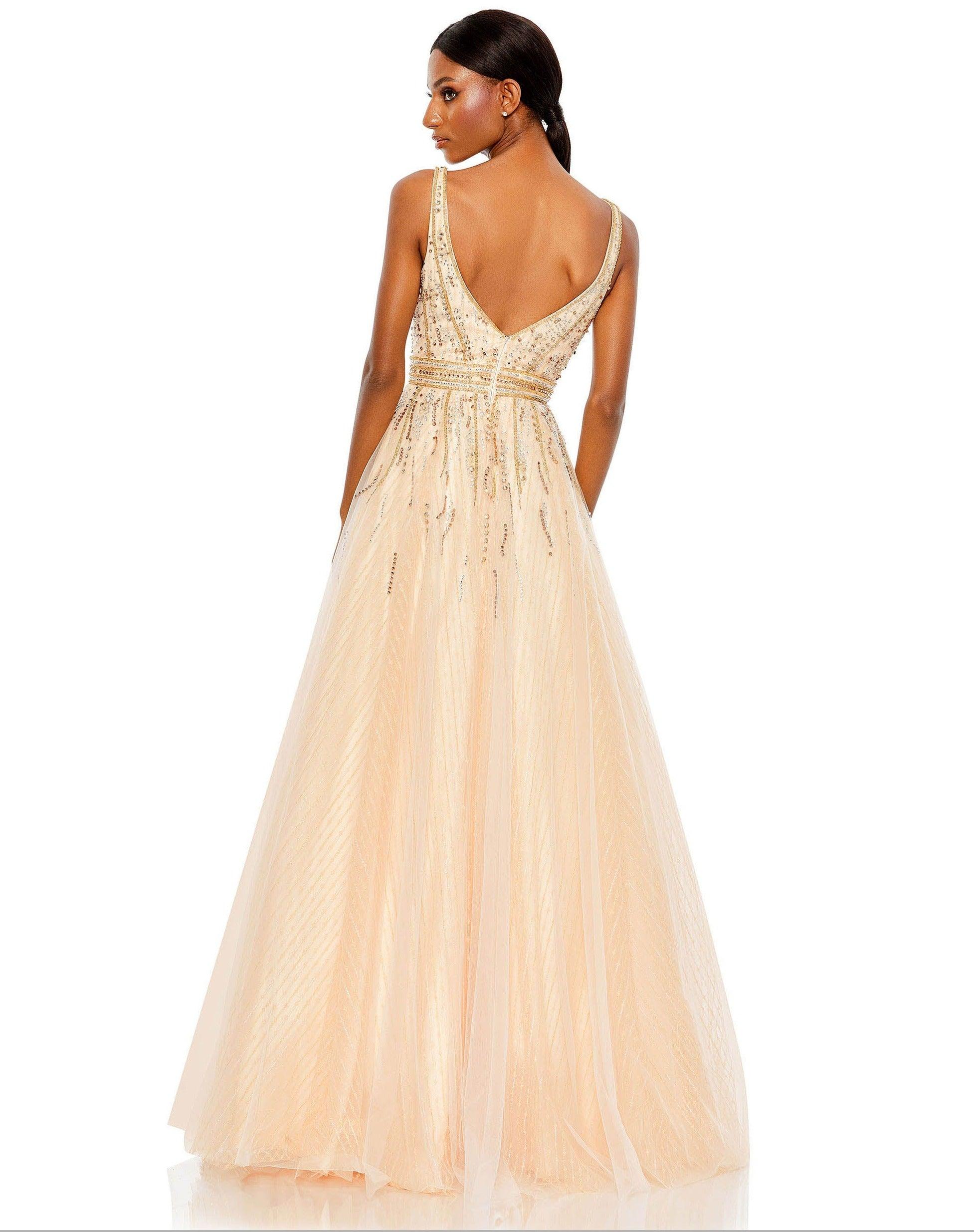 Punctuate your look for an evening of dancing and romance with this stunning gorgeous long prom dress. You will be the belle of the ball in this one! This sleeveless long gown with a V-neckline and a V-back design. This ball gown is made of tulle material. Perfect for any special occasion.