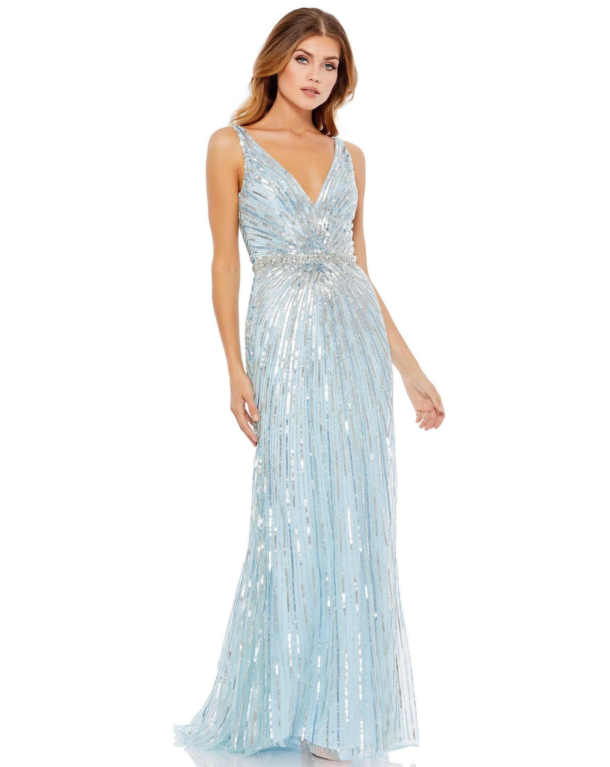 Whether you're celebrating a wedding or just want to mix things up at your office party, this long formal dress will have heads turning. This sleeveless gown features V-neckline with a slim beaded waistband accents. This stylish, versatile dress is just what you need.