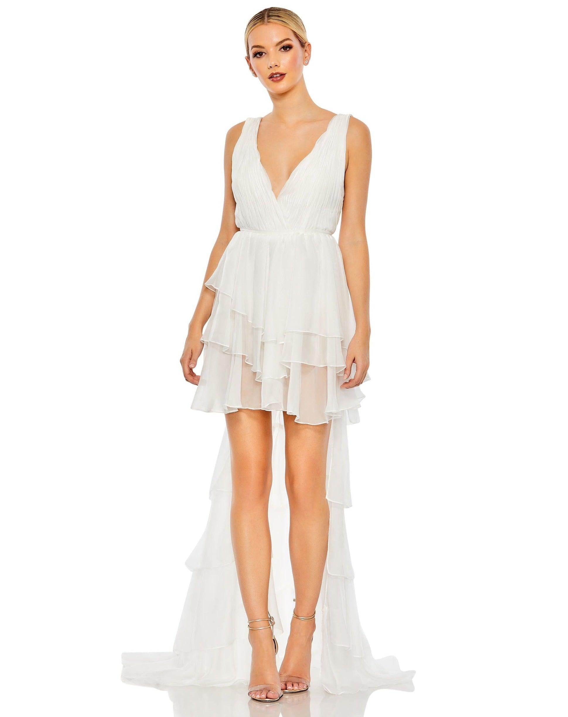 This stunning high low dress is embellished with a deep neckline and sleeveless and low V-back design. A thin waistband tops the multi tiered ruffle skirt and sweep train.