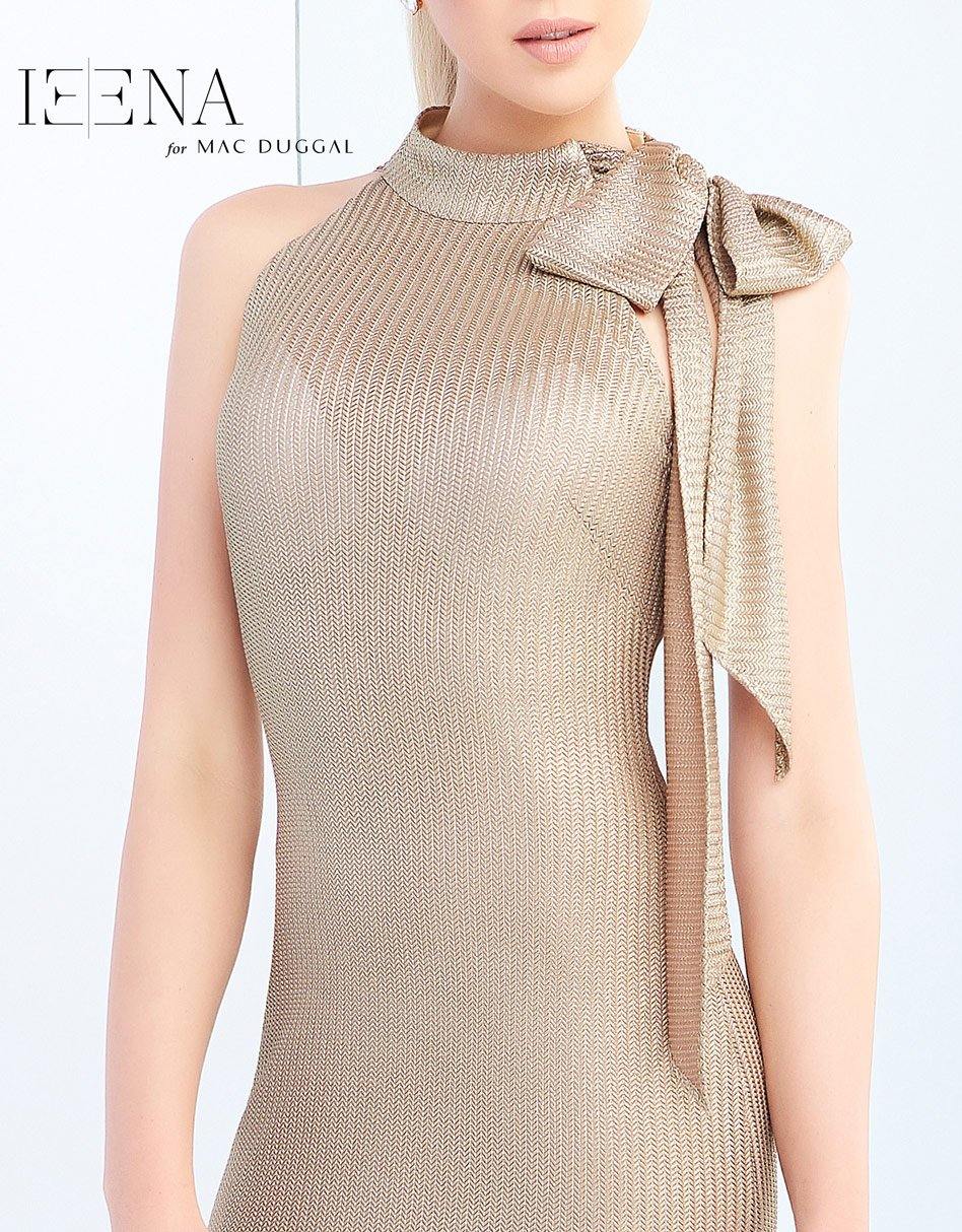 This knitted cocktail dress features a fitted bodice with a high halter neckline in pleated detail with a neckline with a tie. The column skirt narrows to the middle of the thigh. Perfect for any special occasion.