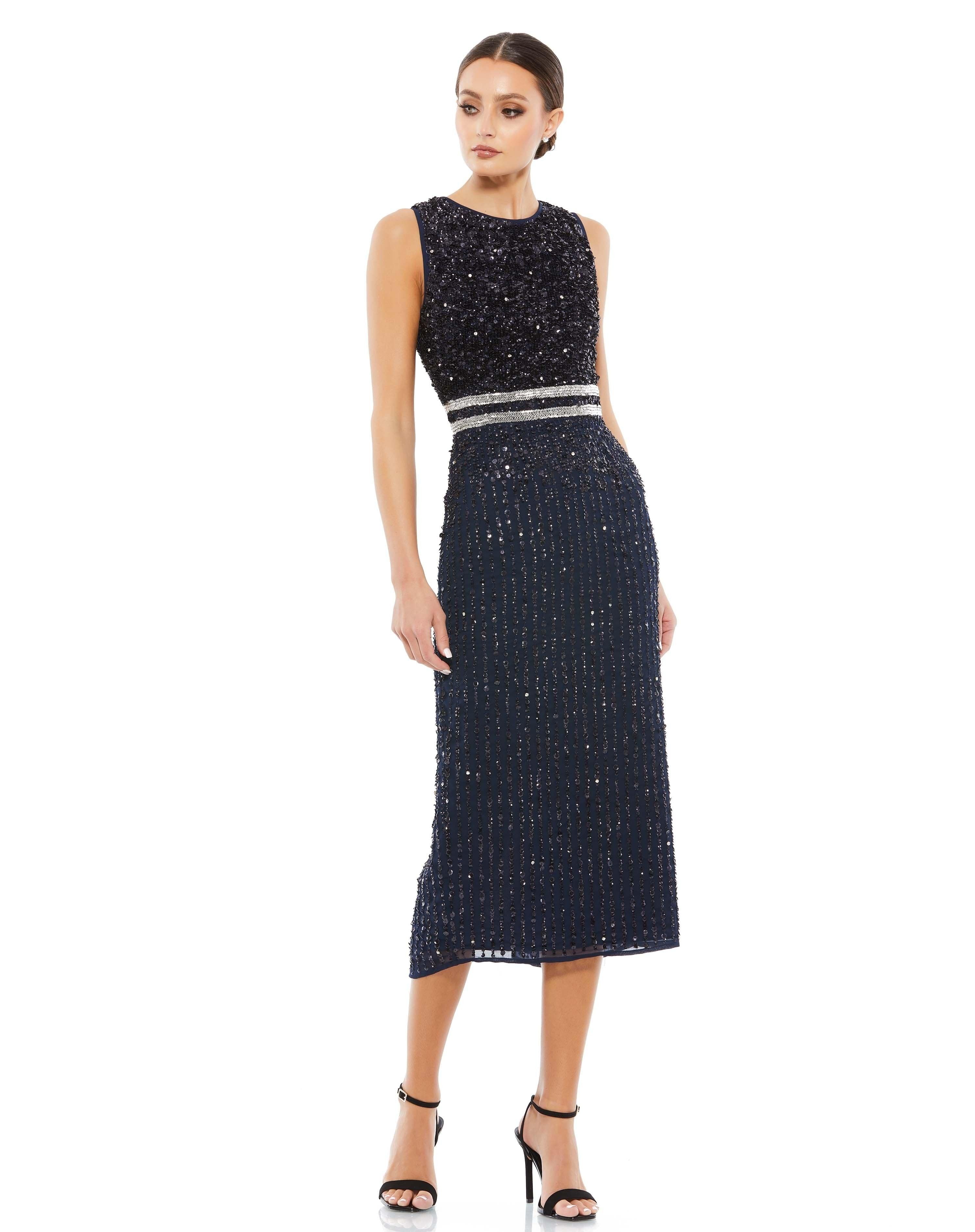 With this sleeveless tea-length dress, indulge in glitz! A center-back slit adds intrigue, and shimmering sequins embellish the waist's flattering shape. Elegantly encircling the fitted top and flowing into a silhouette skirt is the double-embellished bow. a gorgeous option for your big event!
