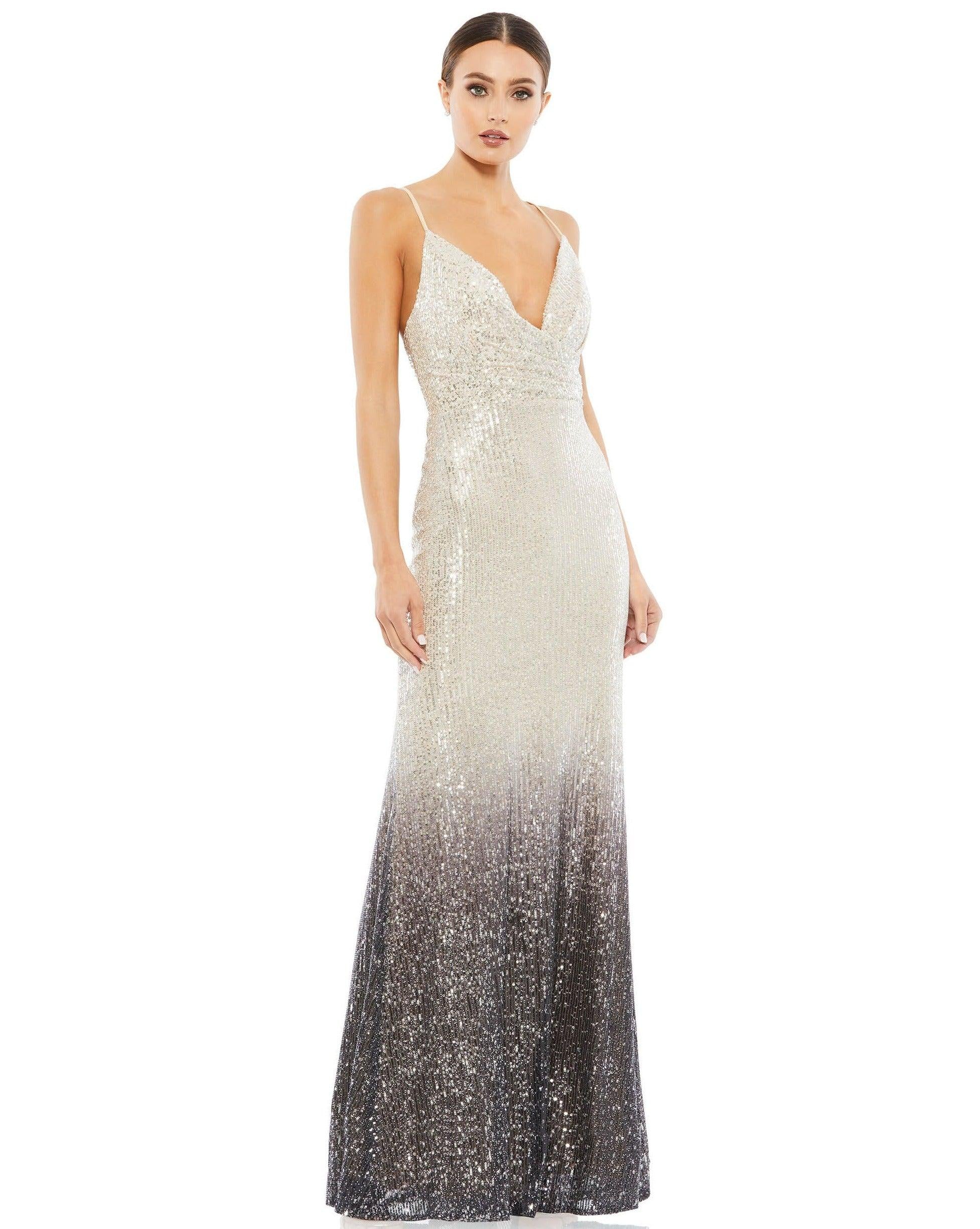 Stunning long gown adorned with an ombre sequins silhouette with a V-neckline with pleats. Asymmetrical draping on the midriff adds flair to this dress.