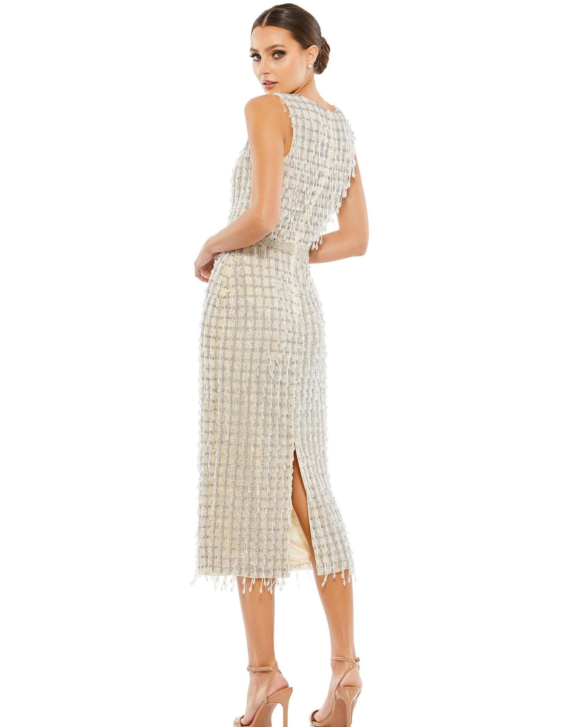 This beautiful nude tea length gown is embellished with lattice beads and crystal fringes with a jewel neckline and a cut in the center back. A mist embellished waist accentuates this fitted dress.