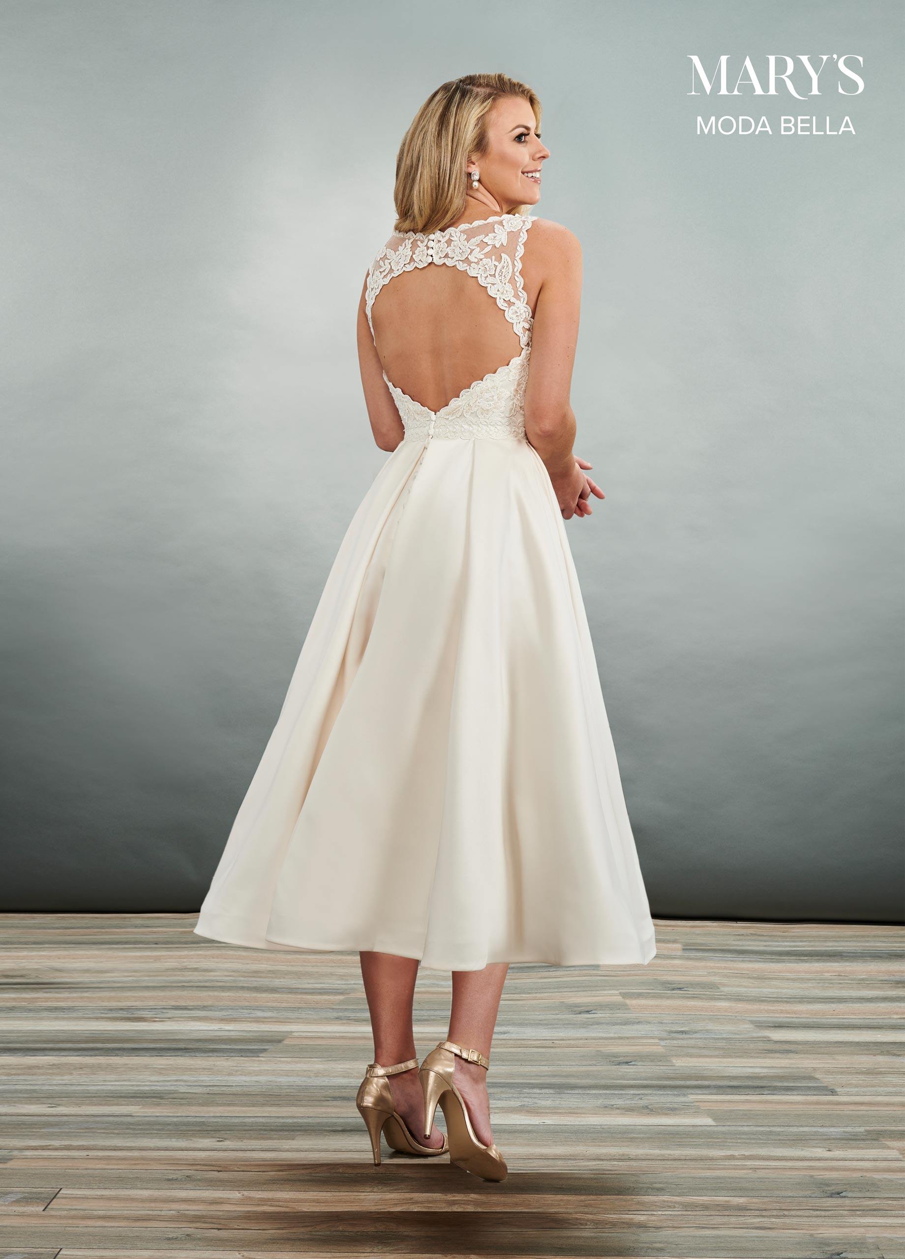 Romantic satin wedding dress. A-line with a silky, sleeveless top with lace applique, cute neckline, and dramatic locks on the back. The dress is finished with pockets at the side seams, hidden buttons to match, and a tea length skirt.