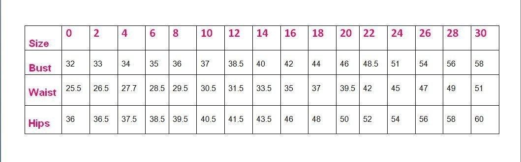 Sizes : 0, 2, 4,6, 8, 10, 12, 14, 16, 18
