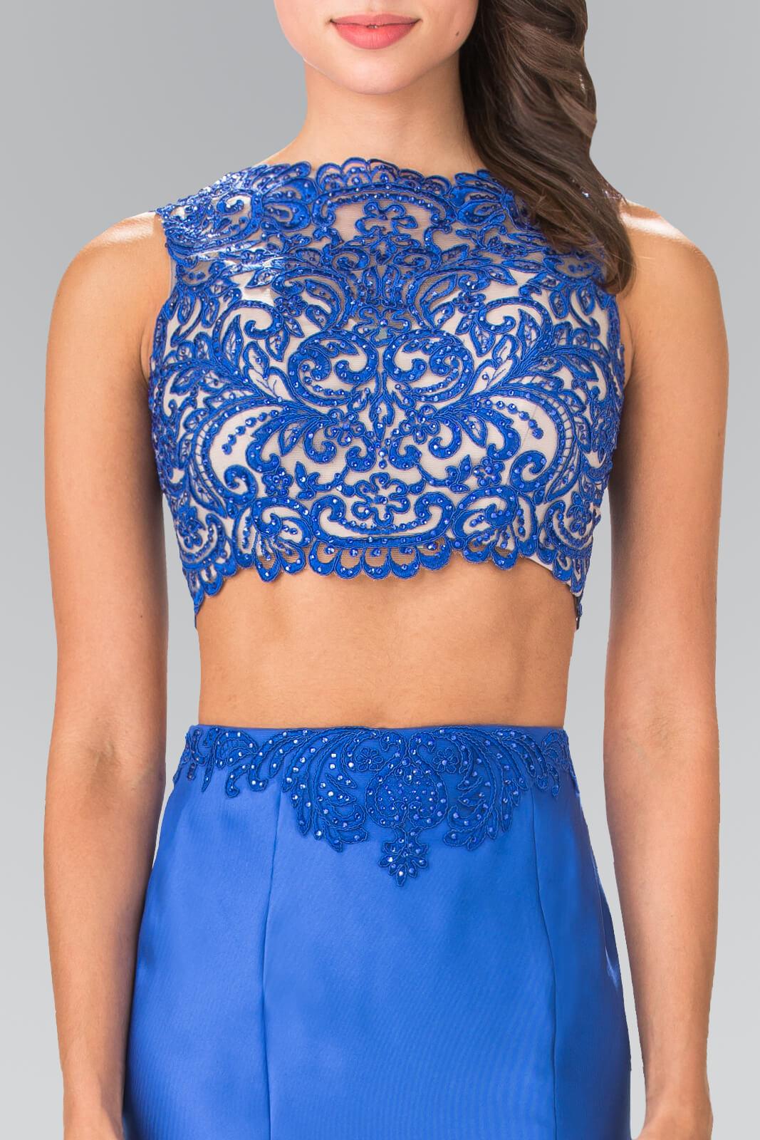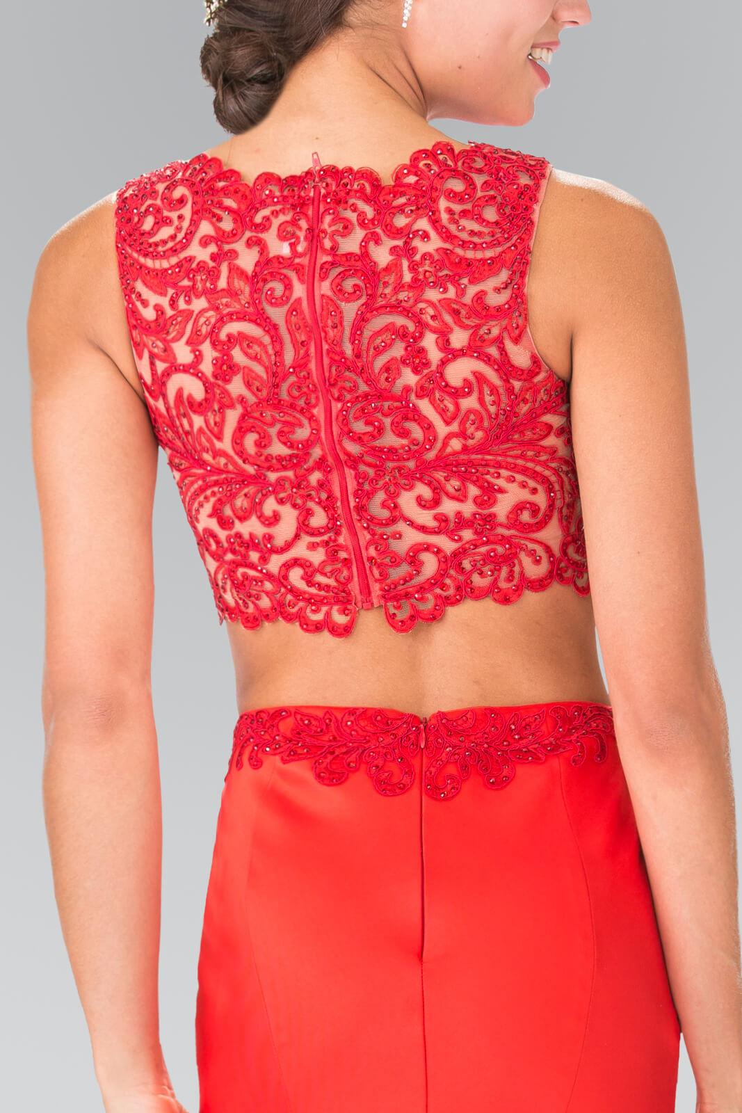 This stunning two piece set long dress features a jewel neck, bra cup inserts and a long trumpet style skirt. Lace covers the top and is placed at the trim on the top of the satin skirt. Perfect for prom, homecoming, formal or any special occasion.