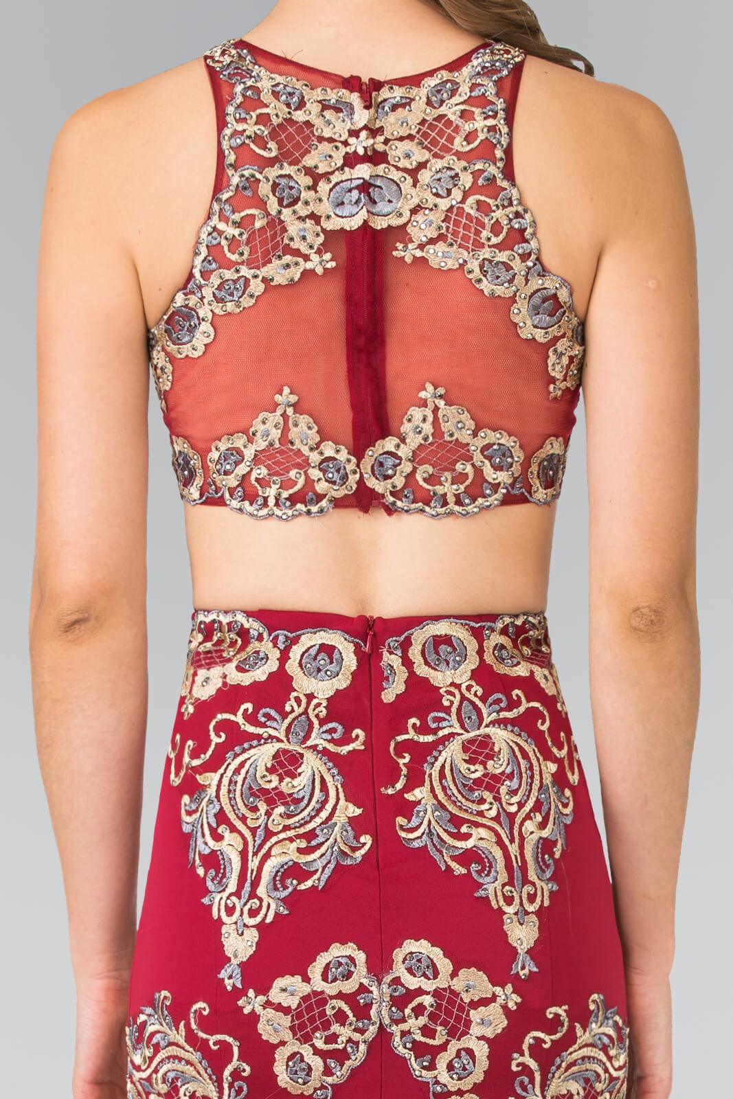 This stunning two piece set long dress features a sleeveless high neck with sheer crop top is heavily layered with silver beads, clustering more on the bust and framed the sheer back. Embellishments remain over the skirt leading a magnificent train. Perfect for prom, homecoming, formal or any special occasion.