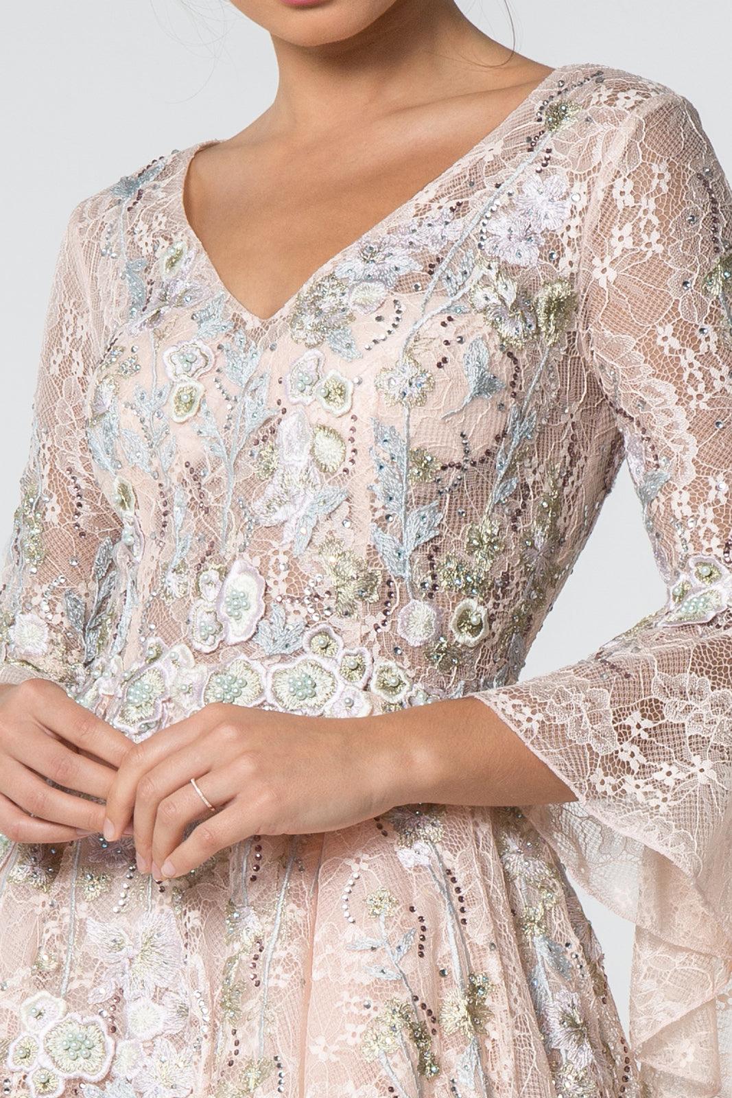 This elegant gorgeous long dress features a soft pastel blossoms trailing the exquisite floral lace fabric, this intriguing piece presents a deep v-neckline frames with slender sleeves ending an asymmetrical flounce. Designed with a sheer full back, the cascading ballgown skirt flares into a lush full-length hemline and a horse-trimmed train. This dress is perfect for evening party, formal or any special occasion.