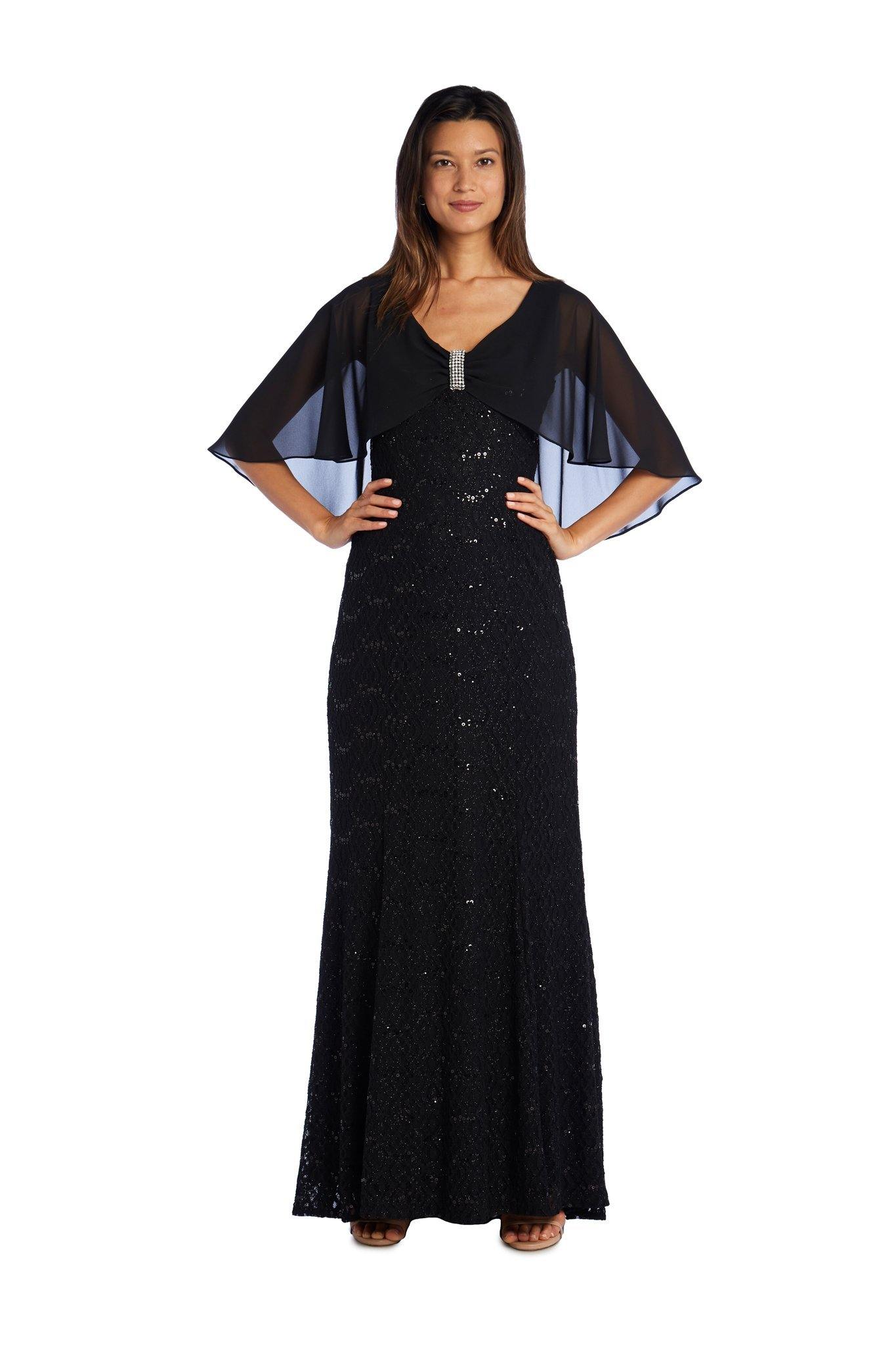 This elegant mother of the bride long dress features a sleeveless V-neck are covered in a sheer cape covering the upper arms, back and clamped at the bust with a diamante detail. The dress is crafted from a textured, lace-like fabric studded with sparkling sequins. Perfect for any special occasion.