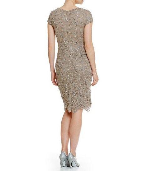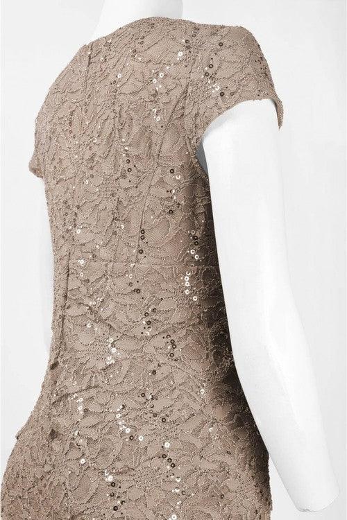 This simply elegant short dress features a low v-neckline framed with delicate cap sleeves and a full back. Beautifully scalloped in tiers, the sheath skirt flows along every contour down to a knee-length hemline. This dress is perfect for any special occasion.