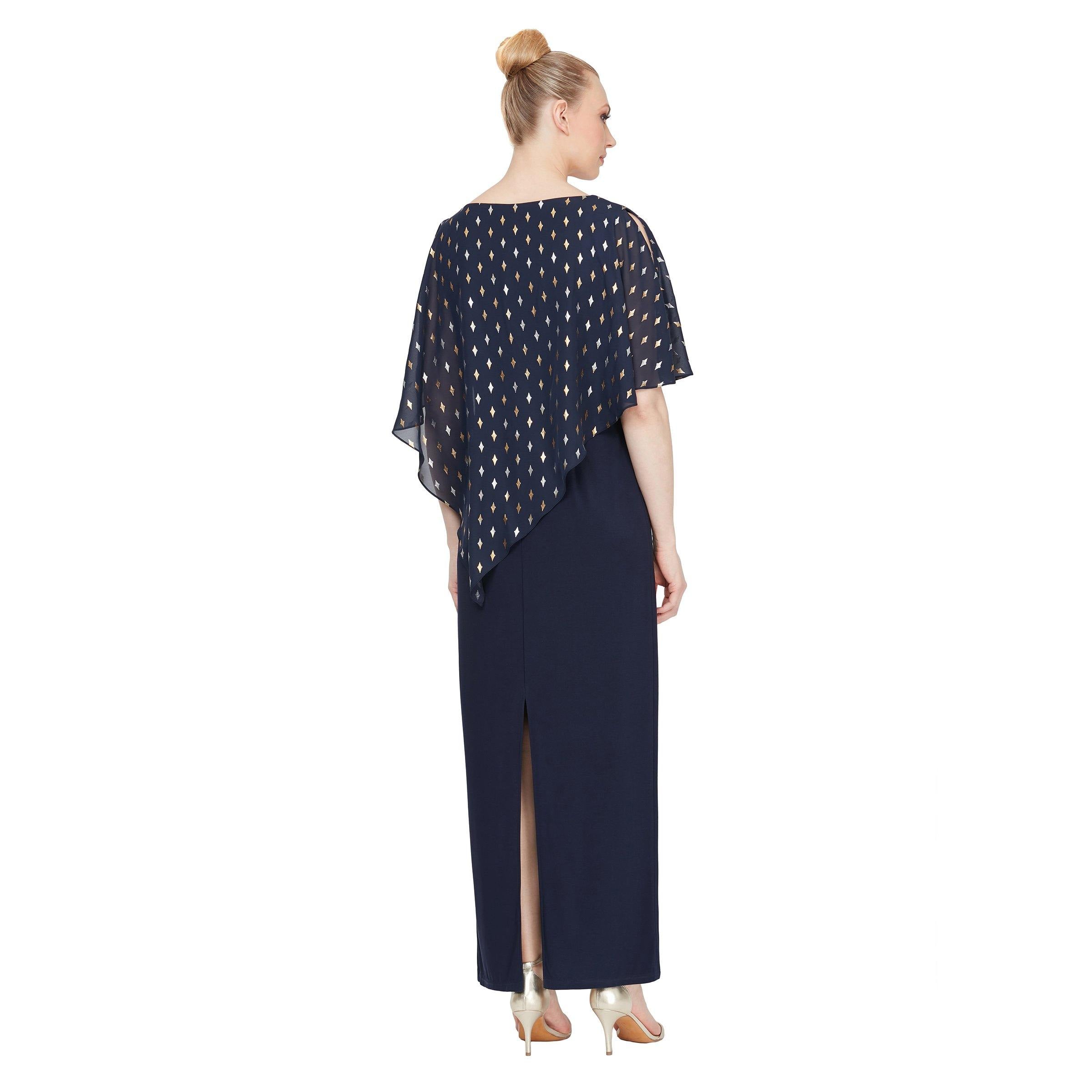 This elegant long dress features a sleeveless crew neckline with capelet. Chiffon dress perfect for any special occasion.