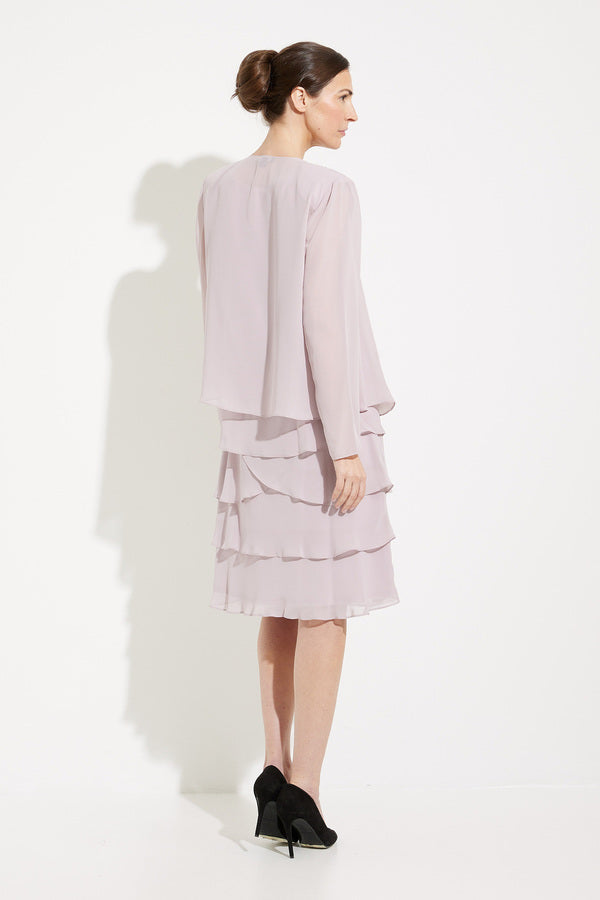 This modest mother of the bride/groom short dress features a sleeveless beaded scoop neckline and is made of chiffon. The skirt is stylish in a tiered silhouette and has a knee-length hem with matching long sleeve jacket. Perfect for any special occasion.