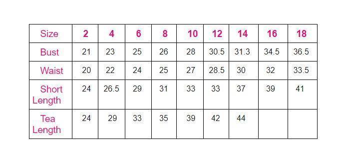 Sizes : 4, 6, 8, 10, 12, 14, 16, 18, 20