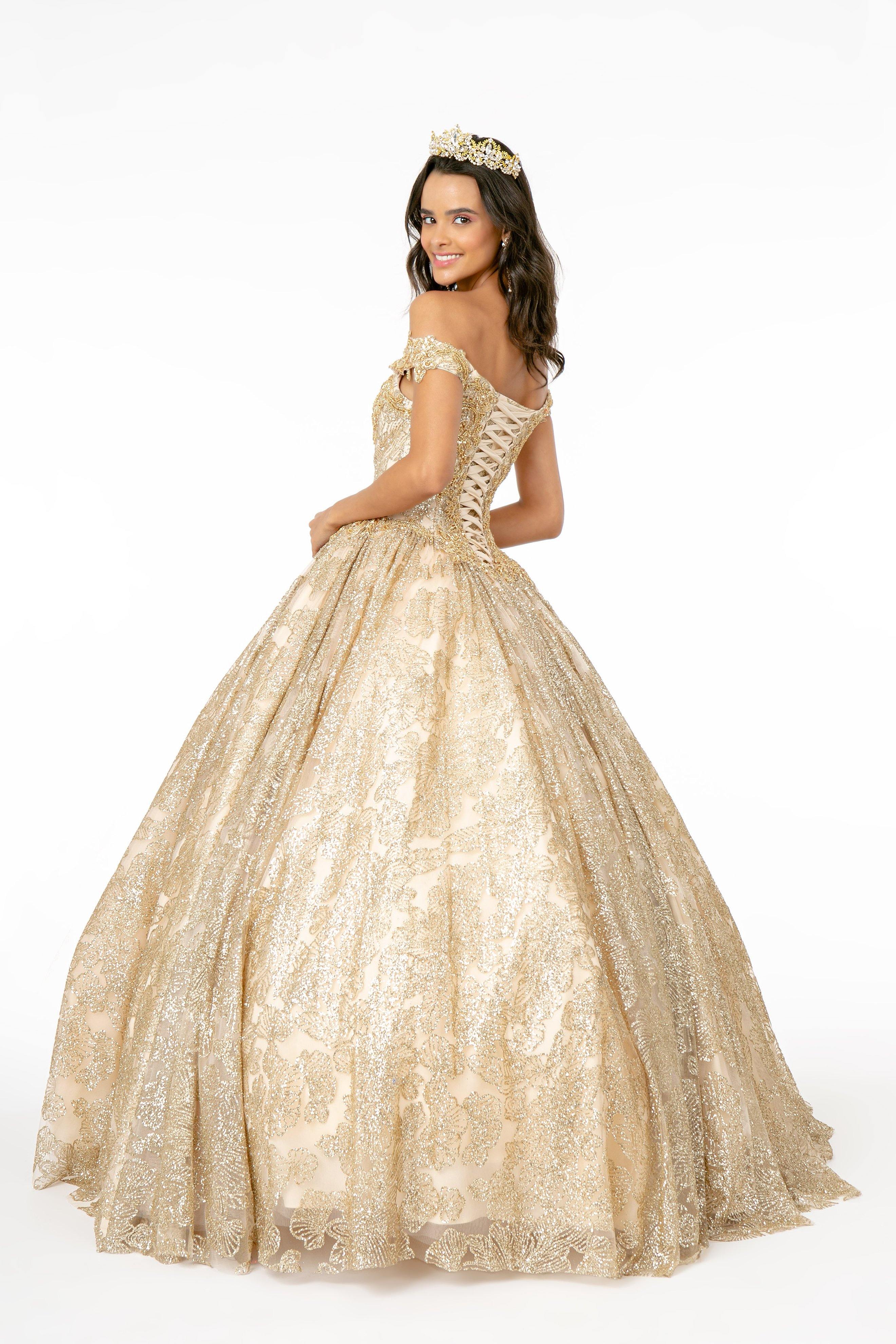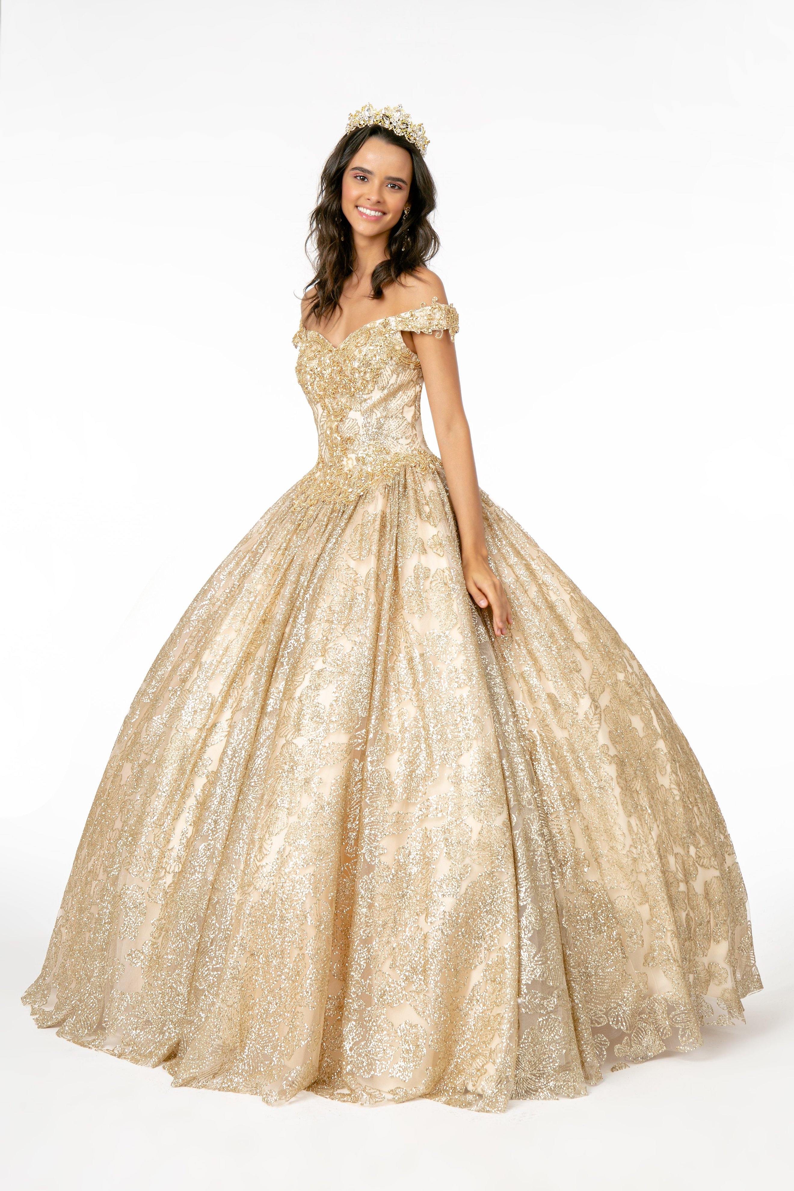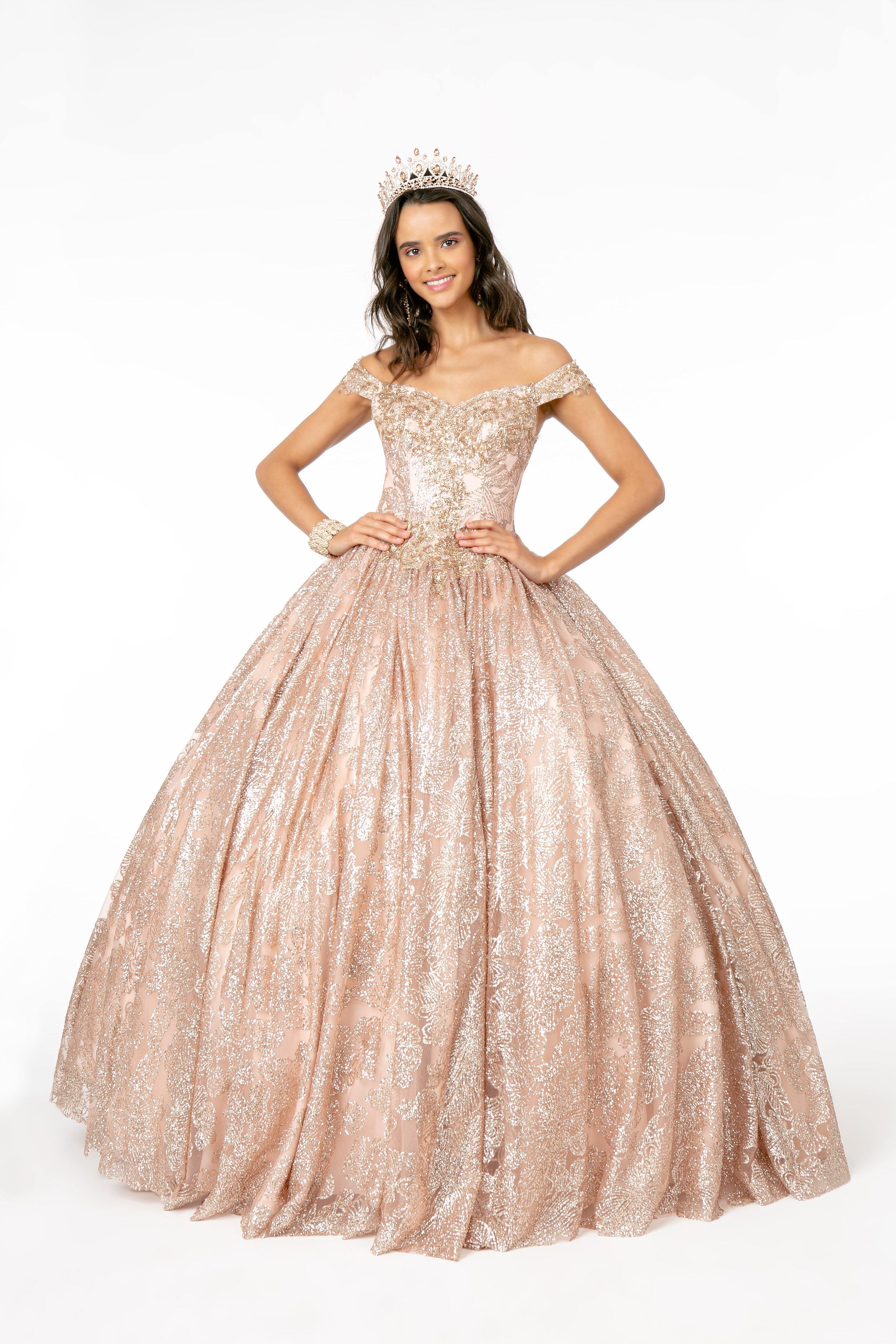 This gorgeous floor length dress features an off shoulder sweetheart neckline. A-line dress with embellished glittered bodice. This dress is perfect for quinceanera, sweet 16, debut or any special occasion or any special occasion.