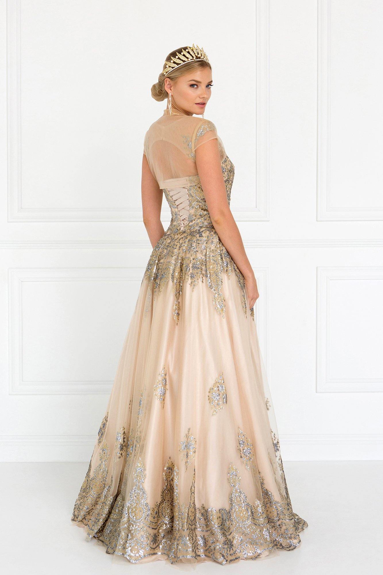 This stunningly gorgeous long dress features a sleeveless illusion sweetheart neckline. A-line dress with decorated sparkling embellished applique.  This dress is perfect for evening party, formal or any special occasion.