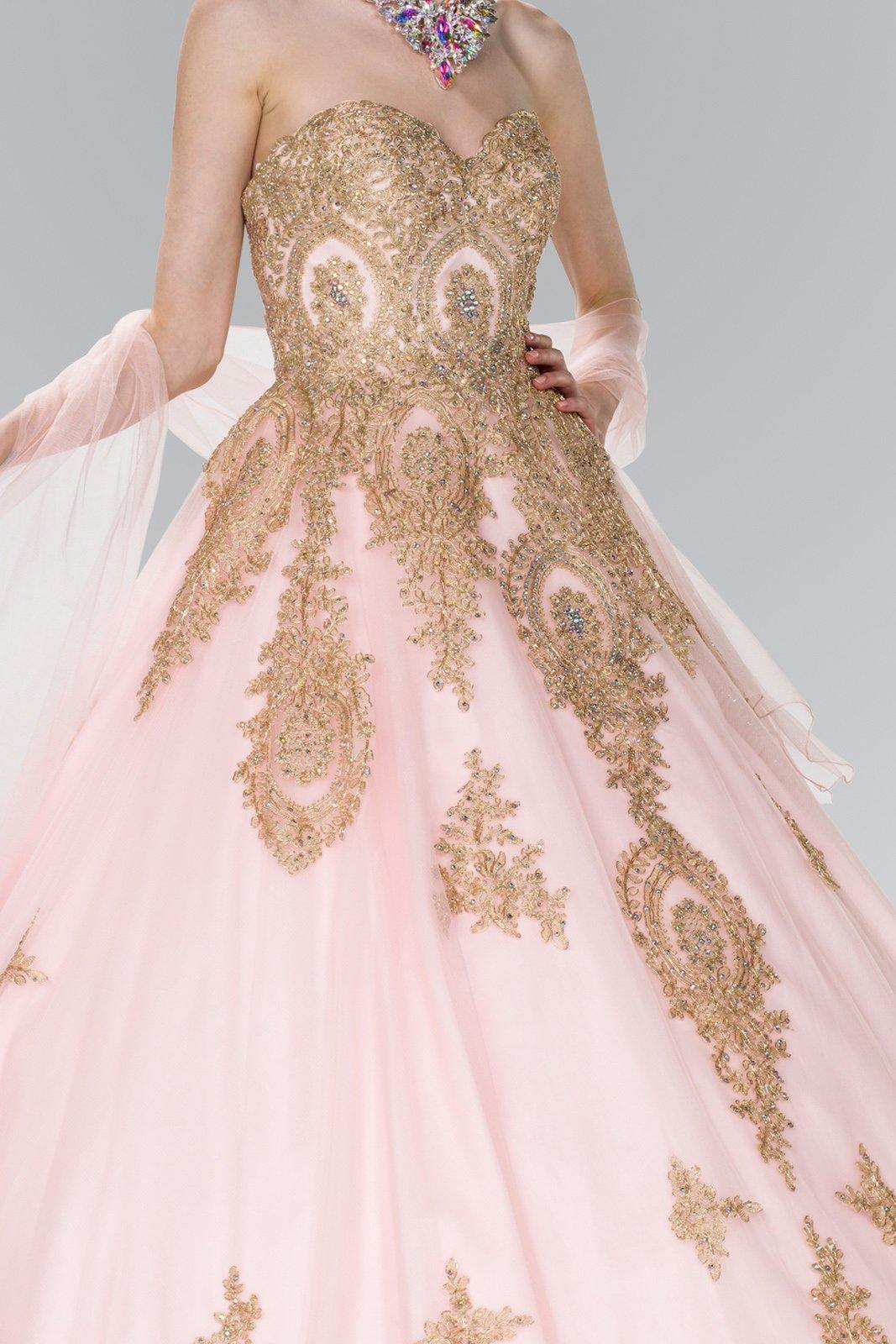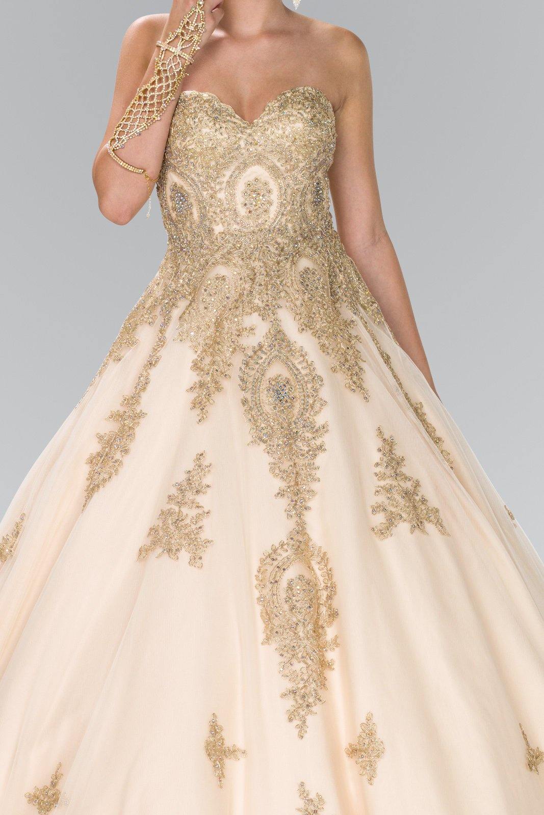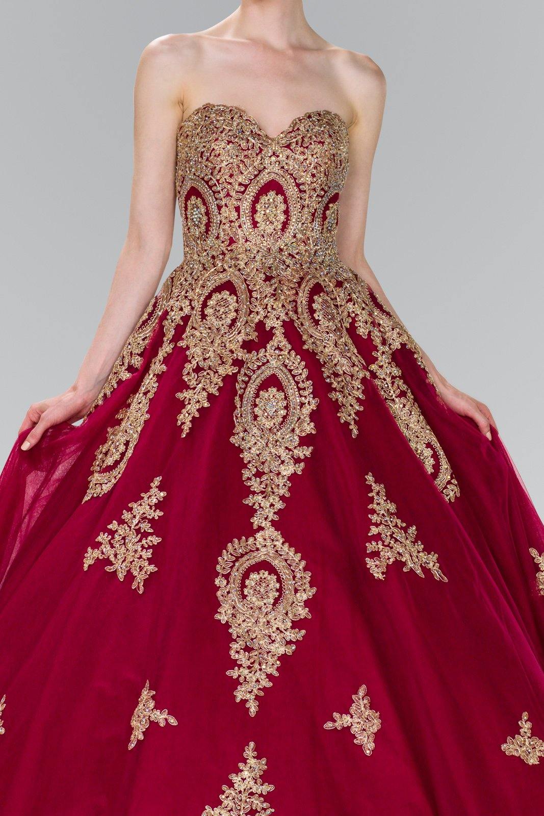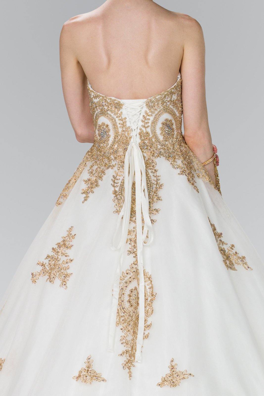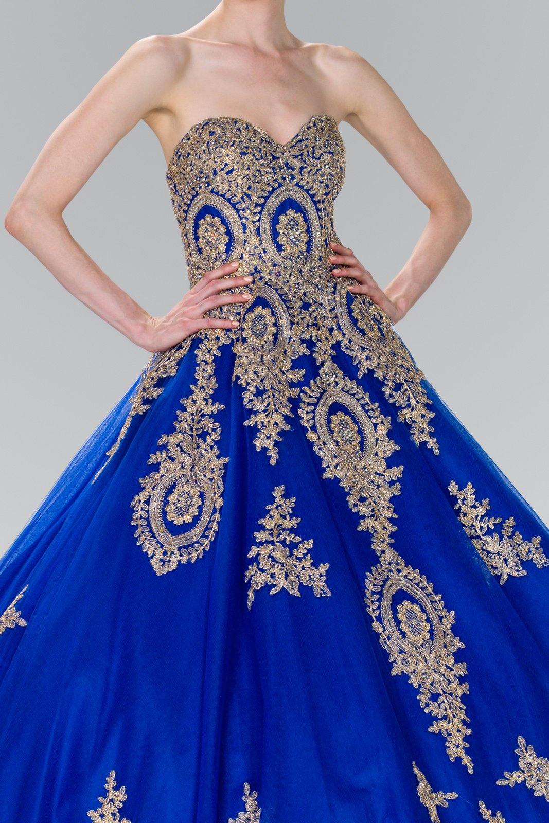 This stunningly gorgeous long dress features a strapless sweetheart neckline. Floor length A-line multi layered dress with embellished beads and lace applique design. This dress is perfect for any special occasion.